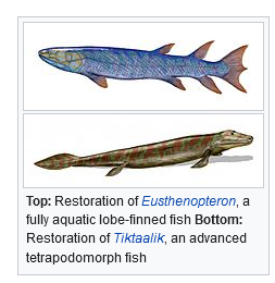 The first major groups of amphibians developed in the Devonian period, around 370 million years ago, from lobe-finned fish which were similar to the modern coelacanth and lungfish.[14] These ancient lobe-finned fish had evolved multi-jointed leg-like fins with digits that enabled them to crawl along the sea bottom. Some fish had developed primitive lungs that help them breathe air when the stagnant pools of the Devonian swamps were low in oxygen. They could also use their strong fins to hoist themselves out of the water and onto dry land if circumstances so required. Eventually, their bony fins would evolve into limbs and they would become the ancestors to all tetrapods, including modern amphibians, reptiles, birds, and mammals. Despite being able to crawl on land, many of these prehistoric tetrapodomorph fish still spent most of their time in the water. They had started to develop lungs, but still breathed predominantly with gills.[15]